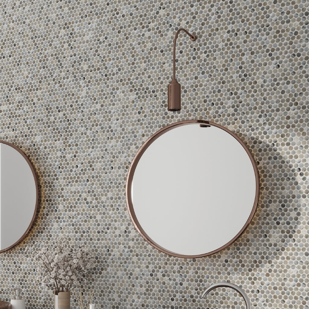 Meet this smoke blue glass mosaic tile: a modern twist on the timeless penny round. The beautiful, misty blue tones feel refreshing and calm, but surprising enough to make you look twice. The small penny tile pattern is visually pleasing, whether you use it on a kitchen wall or bathroom floor design.